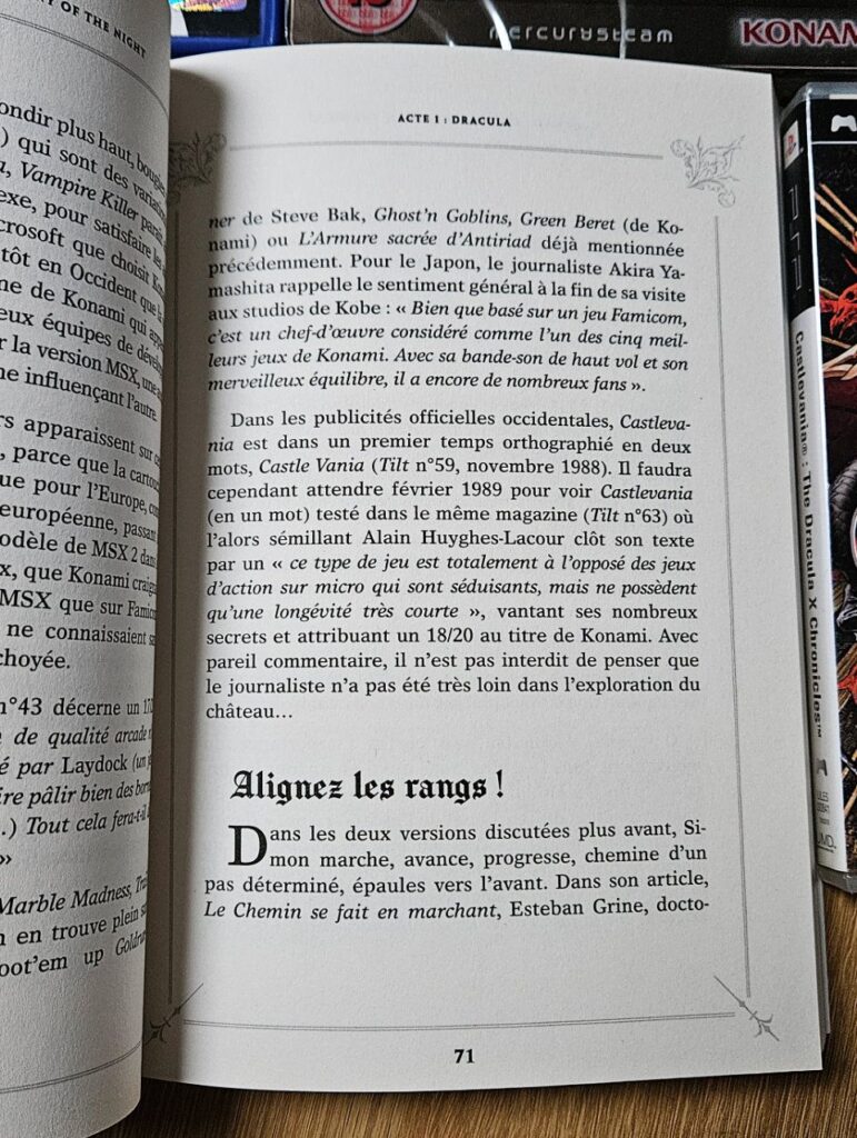 Alors qu’est ce que ce livre apporte en plus ? Tout d’abord, il prend le temps de revenir plus loin que le jeu en lui même et va jusqu’à chercher d’où vient ce fantasme pour les vampires et les créatures horrifiques. Il relie avec simplicité ce contexte littéraire et cinématograpique de l’époque au créateur du premier Castlevania Hitoshi Akamatsu. Un passage qui pourra en rebuter certains en ce demandant où est le rapport mais qui s’avère utile et instructif. Ensuite, comme le titre l’indique le livre est surtout centré sur l’opus Symphony of the Night. On a donc une analyse du level design du jeu, du gameplay et même sur la transformation visuelle que cet épisode donne à la série (un passage que j’ai bien apprécié). Enfin, comme dit plus haut, Raphaël Lucas dépasse le cadre de Castlevania pour parler de manière plus générale du genre Metroidvania auquel la série semble à tout jamais associée.